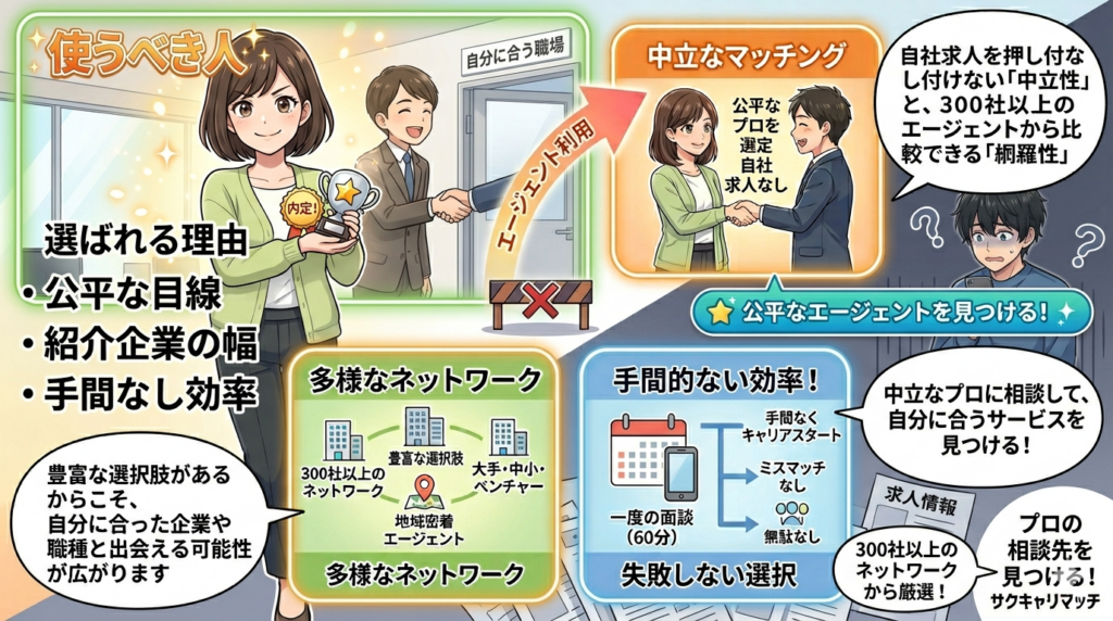 - 企業の「配慮実績」を事前に知れる: サクキャリマッチが紹介する300社以上のエージェントネットワークを使えば、「実際にその企業がどの程度の配慮をしてくれるか」という裏情報を事前に把握できます。